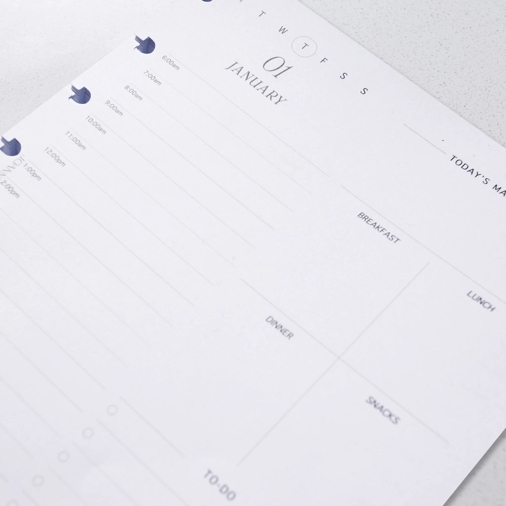 Each page is dated for 2026 and designed for maximum clarity, featuring a full daily schedule from 6AM to 10PM, space to set your daily focus, plan meals (breakfast, lunch, dinner, snacks), list your to-do's, and capture important notes— all in one beautifully laid out page.